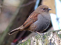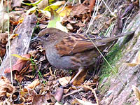 2010年11月20日(土) in金剛山 ハギマシコが居たらしい 一度金剛山へ行きたいと思っていたが、丁度天気だし、どこといって目ぼしい所もないので、難波でお得切符を買い、バスで河内長野からロープウエイ駅まで行った。そこから念仏坂を上ること約1時間。途中、カヤクグリ・カケスを見たが、撮れないまま、伏見峠に着いた。そこで一人のバーダーに会い、4・5回いろんな場所で出会った。というか出会ったバーダーは彼女一人だけだった。早朝オオマシコをキャンプ場で見たそうだ。また、星のミューゼアム館では、11/12にハギマシコが出たとのニュースを得た。勿論ウソも居るそうだ。いよいよ冬本番を感じる。一番多く歩いたのはキャンプ場周り。ここではカヤクグリをゲット。葛木神社まで行ったが、見れたのはミヤマホオジロ・ヒガラ・カラ類・ウソ(声)など。いずれも写真は撮れなかった。過去に探鳥会に参加はしているものの、あまりコースを知らなかったので、今回大体のコースが分かったのが良かった。また来ようっと。 (←ゲットできたのは カヤクグリ だけ) |