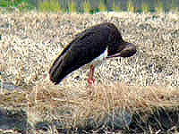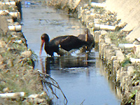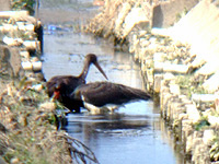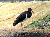 年末に出水のツル遠征時に九州を縦断したが、再び珍鳥・ナベコウを求めて九州へ行くことになった。しかし、予定がずるずると延びて、聞いてからほぼ1ヶ月にもなると、抜けたのではないかとヒヤヒヤ。夜行バスと高速バスを乗り継いで、現地に着いたのが10時。そこでさらに無料自転車を借りて、干拓に一直線。ポイントの肥料屋さんに着いたが誰も居ない。地元の方に尋ねたら、もっと西だとか。行ってみても要領を得ない。あせっていると箕面での知人と出会い車便乗、吾妻干拓へ走った。が、ここにも居ない。結局朝から昼過ぎまで森山干拓に居たらしい。悔しい・・・。収穫は出水よりずっと近い距離で撮れたクロヅルだけで一日目終了。暗い気持ちで老舗の宿に入り、パタンキュー。 翌朝は朝一番に昨日いたという場所へ行ったが、何台かの車が一様に「今朝は見ない」と。ショック!そういえばナベコウには最初から縁が無かったなぁ。諦めて昨日色々居たらしい葭原をのぞいたが、今日はさっぱり。ところが、偶然吾妻干拓に居るかもと教えてあげた人から「居ますよ」と連絡あり。一目散で自転車をこいで約7km。水路に居た・・・!親子で意外とゆっくり採餌に没頭中。しかし距離が遠く、陽炎がたって、写真がぼける。車の人はさっさと反対のほうへ移動。私はもたもたしているうちに、地元のおじさんが近づいてあっけなく飛び立った。2羽で上空を30分くらい悠然と旋回し、次第に森山干拓の方へ流れていったようだ。あぁ、もっとちゃんと撮りたかった・・・。思い直して、残った時間を側のシベリアュリンのポイントで過ごした。オオジュリンに混じってコホオアカも居た。今回目的の一つ、ホシムクドリは見れなかったが、これはまたの機会にお預け・・・。自転車を返して博多へ移動、夜行バスで帰阪した。 |