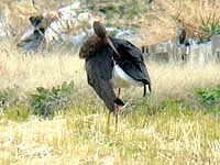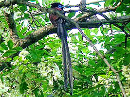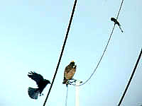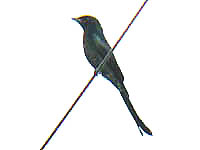 二日間で目標の3種を一応ゲットできたので、最終日は昨年ツルクイナを見た福岡へ移動。思いがけずカササギがたっぷりのパフォーマンスをしてくれて、これで今回は納得の終了と思っていたら、昼前にビッグニュースが舞い込んだ。すぐ近くにオウチュウが出ているらしい。慌てて詳しい場所を確認してすぐに移動。しかし現地に着いたら誰も居ず、オウチュウも何処か分からない。途方に暮れかけた時、やっと芝生に座り込んでいる一人を見つけた。見ると傍の電線に独特の尾っぽのシルエット。「居た!」ミヤマガラスに絡まれては元の電線に戻る、何とも優雅なシルエット。でも、意外と小さくて地味。全身黒色で、余程近いか、良い光線でなければ、写真泣かせの鳥だ。私は証拠写真で納得。ついでに側の川で、クロツラヘラサギとヘラサギを撮って、夜行バスまでゆっくり遊んだ。ちなみに、夕食は店に入って、博多ラーメンとギョーザを食べた。 (←オウチュウ・条件が良くないと羽の細部が出ない。) |