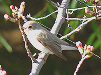 ![]() 確かに喉がオレンジ色に変わってきたオジロビタキ♂(南千里) 桜の蕾の中でひときわ愛らしい。 |