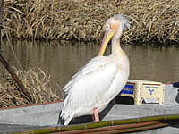 前夜ラッキーにも車便乗にて初見種・サバクビタキに出会えた。先に河北潟で出た時は、今いちポイントが分からずに諦めただけに嬉しい。若♂で第一回冬羽とか。現地には未明に着き、明るくなると続々と車が詰め掛けてきた。主役はのんびりしていて撮り放題。ただ、カメラの設定を前回のISO感度1600にしたままで撮り続け、ほんの最後になってやっと正常に戻したので、ほとんどがダメ画像。何で、こう、いつもいつも、失敗つづきなんだろう・・・。せっかくなので近くの桃色ペリカンの篭脱けらしきを見て帰った。 | |