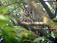 数年前、安威川の探鳥会ではいつもトラフズクを見ていたが、その頃は証拠に写真を撮る趣味は無かった。プロムナを持ち始めて偶然デジカメを当てたら、意外ときれいに写真が撮れた。それ以来見た鳥の写真が欲しくなってしまって現在に至っている。というわけで、珍鳥には程遠いが、トラフズクが出たとなれば、やはり雨模様であれ出向いて撮らねばならぬ・・・。行ってみるとすでに情報が広がって大勢のカメラマンが続々集まってくる。枝葉の中で静止する鳥の全身を見れるのはほんの1ケ所のみ。まぐれで目を開けていたらラッキーと、同じような写真を何度となく懲りずに撮る涙ぐましさ。でもここはこれだけでなく、アリスイでも有名な場所。おまけにタシギやクイナも葭原から姿を出して、いつにない騒動に輪をかけている。雨も恐れをなして昼過ぎまでは曇り空。うーん、来てみて正解! | |