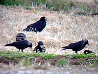 ![]() コクマルガラス・中間型 手前、畦の上にコクマルガラス2羽・あとはミヤマカラス |