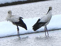 日本列島は今冬一番の寒波にスッポリ。当然豊岡は一面雪野原。コウノトリ3羽とツクシガモ1羽が居ただけで、お目当てのコミミズク・ヤマヒバリは見れなかった。おまけに、またもや風でカメラを壊してしまった・・・(涙)。風邪を引かなかったのがせめてもの幸い・・・。 | |
