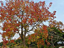 俳句の題材が欲しいから昆陽池に行きたいという友達を案内がてら、自分も久しぶりにカモを見に行ってみた。なんと、驚くほどカモが少ない。ひそかに期待したミコアイサなんか影も形も無い。おそらく10年ちかく棲みついているらしいコクガンだけは、かろうじて健在。池の周りでは種々の紅葉が鮮やかさを競っていた。 | |