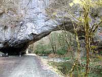 カワビタキ♂が居るらしいが、1日出て2・3日出ず、またひょっこり出て数日出ない・・・の繰り返し。遠出していくには余りに不安定で躊躇していたら、偶然車便乗の声がかかった。ならば当然行きますよ。・・・が、やはり現実は甘くなかった。居たのはカワガラスばかり。食堂で先に撮られた写真を見る限り、居たらすぐに分かる鮮やかな鳥なのに、気配すらなかった。「抜けたんだよ」と同行者の弁。私は、まだどこかに居ると思うのだが・・・。安定して見れるようになれば、また来ようっと!それにしても名所帝釈峡の雄橋って、迫力満点。以前は岩の上を橋として通行できたそうだ。 | |