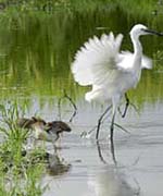 ![]() どの田もタマシギ親子が大人気 (左)行く手を阻むコサギをお父さんが羽を広げて威嚇。(中)それを見た子供たち4羽も次々に羽を広げて皆で威嚇。 (右)数の力に圧倒され飛び去った後を悠々と凱旋行進。 |