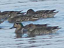 ![]() 左手前・アメリカヒドリ♀ 右奥・ヒドリガモ♀ アメヒ♀は頭から顔全体がグレー 右手前はただのヒドリガモ♂ |