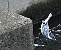 鳥運のある時って連鎖的に来るのかな?先般2連チャンではずれたヤマセミが今度は♂♀を一挙にゲット出来そうだと、昨日淀川で情報をキャッチ。今回も聞いてすぐ行動。現場に着く前に、畑でカラスにモビングされているノスリに出会った。飛びものは無理だが、1枚だけ何とか証拠。ダムに着くと先客女性が一人、真剣にカメラを向けている。おぉ、ヤマセミ様がオンステージだ。胸元が少し赤茶色でこれは♂。運良く魚目がけてダイブの瞬間もゲットできた。それから2時間後、今度はキョッキョと鳴きながら♀の登場。動きも活発で、魚を食べたら遠くの岩に飛び移り、さっさと流れの奥へ戻って行った。 | |