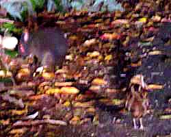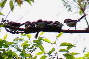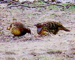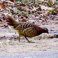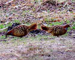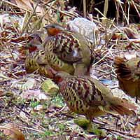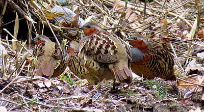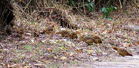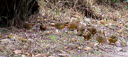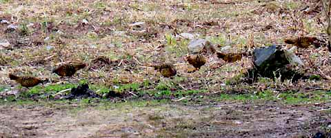 ![]() コジュケイ ファミリー?全部で12羽 左の暗い部分に1羽潜んでいる。 前回よりずっと近かった。 |