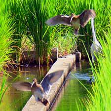 朝一レンカクの情報。夏羽ではないし、琵琶湖までは遠いけど、行かなければ撮れない・・。迷う暇もなくGO!自分のミニサイクルを輪行するか迷ったが、やはり駅のレンタサイクルが楽。ところが、長浜駅から北陸線の連絡に45分の時間ロスがあり、長浜駅で借りるべきか、河毛駅かと迷った。長浜からポイントまでは距離は倍だがロス時間を走れるが、帰りも倍走って返却となる。河毛駅ならポイントまでは30分だし、以前走った道だし、やっぱり河毛駅がいいかな。(後になって、河毛駅が正解だったということになる) ともあれ現地に着いたのはお昼頃。顔見知りがズラリ湖面にカメラを向けている。逆光で、遠くで、厳し~い。近くに来てくれるのを黙々と待つうちに、緑の蓮の葉の方へ飛んだ。あぁ、撮れなかった・・。今度は柵の方へ飛び、脚が見えた。動くたびに一喜一憂、何度目かでやっと飛びものが撮れた。そこへ電話。居合わせた鳥友さんから近くのコウノトリ6羽の情報。え、すごい!でも自転車では無理そう・・。河毛駅を挟んで真反対側になる。でも鳥友さん、駅まで戻ったらそこから車便乗を提案してくれた。有難う!天にも昇る思いで、コウノトリの場所へ。池の一番奥の暗い処に6羽が思い思いに寛いでいる。遠さの所為か靄っている。そのうち池沿いにもう少し近い場所を見つけて何とか飛びものもゲット。あれ、コウノトリの前をオオヒシクイのグループやオシドリのエクリプスの群れが泳いでいく。湖北周辺ならではの収穫に大興奮。鳥友さんお世話になりました。有難うございました。 |