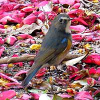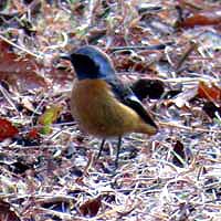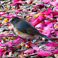 ![]() 【緑地・小鳥の森】 ルリビタキ♂若 山茶花の花びらじゅうたん絡み |
