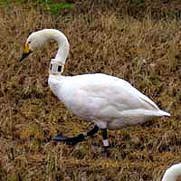 コハクチョウ フラグ付きの子が1羽(右脚「3124」、左脚「A27」と読み取れる) |