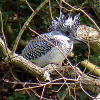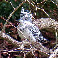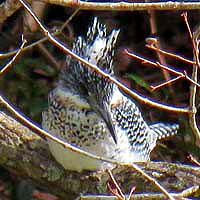 ![]() ヤマセミ♂? アップして見ると、胸の斑点部分が茶色っぽい。 隣の枝へ少し飛んだ。 |