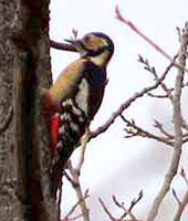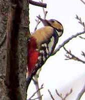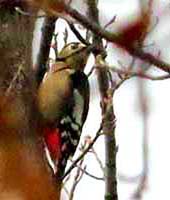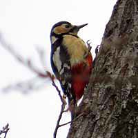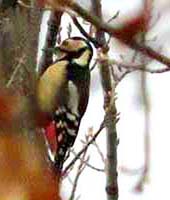 今年も樫の木公園にアカゲラが出ているらしい。例年通り塒入り直前に戻ってくるところを待つ。今日は雨がパラつくかと思われるほど天気がイマイチ。曇っていて寒い。だから他に誰もカメラマンが居ない。今回の巣穴の木はどれだろう?探して分かるわけもなく、じっと待っていると毎日散歩の人が時折「出ますか?」と挨拶代わりに声をかけてくれる。約30分、偶然ごちゃごちゃの木の中にアカゲラのシルエットが見えた。あ、居た!一人で探せるか不安だったが、何とかクリアー。一度近くに枝移りしてから、カラスが来て飛んで分からなくなった。おぅ、取りあえず撮れたぞう。!回りはほどなく薄暗くなり、急いで帰途についた。 |