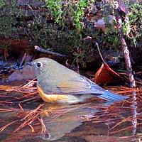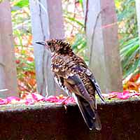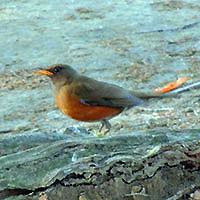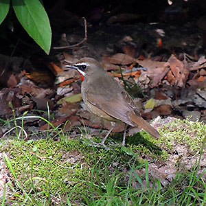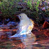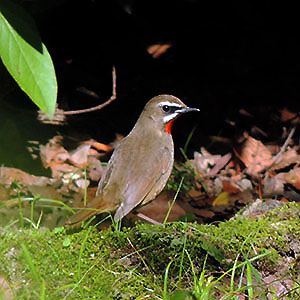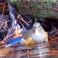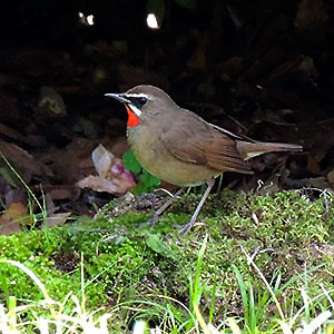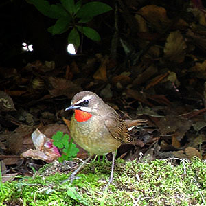 クロツグミがずいぶん長く居るようだ。木止まりだったり、水場だったり・・。今回は胸の斑点が少し赤みがかって、どうやら♀タイプ。背中の羽が黒っぽいので、多分♂の若だろう。 突然、「コマドリや!」と誰かが叫んだ。たしかに、水場にそろりと出てきたのはコマドリの♀のようだ。♀の若か、かなり色が薄い。しかし姿はまぎれもなくコマドリで尻尾をピント立てる仕草がかわいい。おぉ、今季初だ。春コマドリ、秋ノゴマ、と言われるように、秋はコマドリが出にくいので♀ながらうれしい。 |