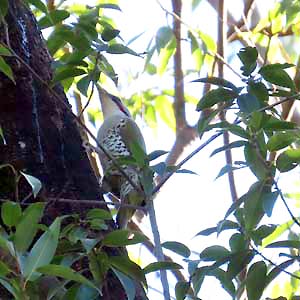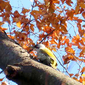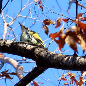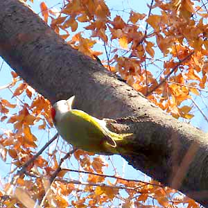 やっと苦労の甲斐があったというもの・・。 11:00、アオゲラ♀を白樫の樹でやっとゲット!やはりこの時間だった。少しすると、もみじした葉が明るい樹に移り、多分トータルで5分位。最初の木は当然樹液が滴る傍。ここ数年、小鳥の森に出ていたが、この緑地のどこかにいつも潜んでいるようだ。 その後、小鳥の森に移動、珍しくウグイスが出てきたり、以前から居ついているルリビタキ♀が出てくれた。 |