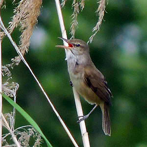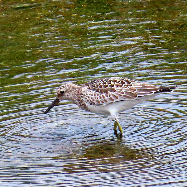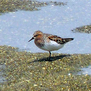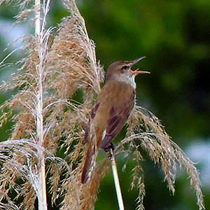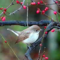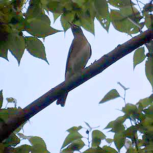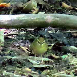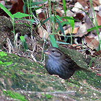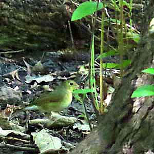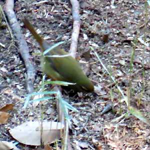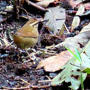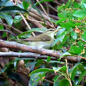 1週間ぶりに服部領地を覗いてみた。前回はきれいなおオオルリ♂が出ていて大満足だったが、今日は?おぉ、ヤブサメがまた出ている。秋一番の渡りのコルリ♀が入ったときにも、つられて出てきて、それから時々出ているようだ。地味な鳥だが、なかなかの人気者。何処に居てもとにかくわかりにくい鳥だが、はっきりした眉斑で気が付くことが多い。 | |
