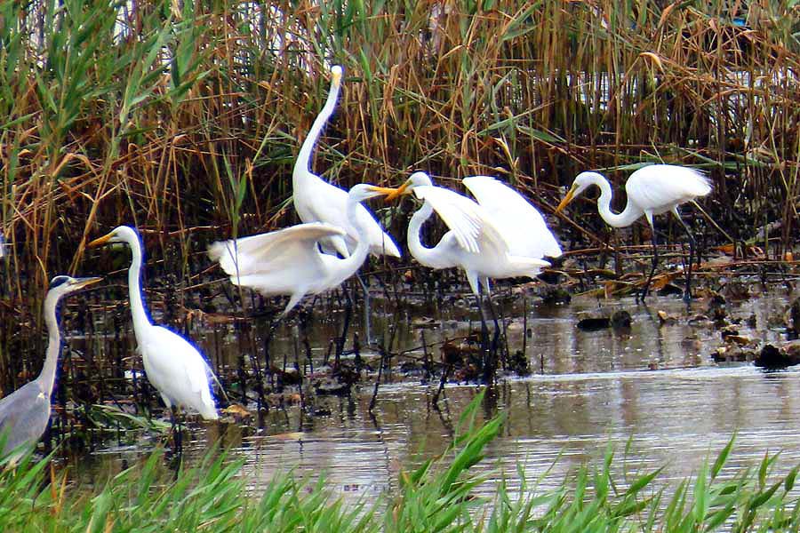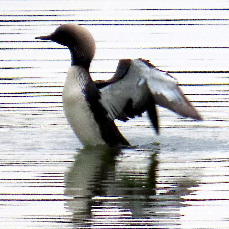 強風の一日。10mを超すほどの風速の日に、何を血迷ったかふらりと南港野鳥園へ出向いてしまった。それでも園までの1km余りの道のりではそれ程風の強さを実感しないまま野鳥観察室へ入った。それなりにカメラマンが居るが、さずがに窓は閉めている。何か撮るときだけ窓を開いて、撮り終わるとすぐに閉める。やはり屋内というのは雨風を凌いでくれるので便利だ。本命のヘラサギが見当たらないので聞くと、さっきまですぐ傍の窓下に居たが、雑草掃除の係員が入って飛んだそうだ。え、そんな・・、と失望しかけたが、「今、向う岸に戻って来たよ」と教えられた。確かに、遠いけど白い2羽の大きめの鳥が居る。嘴がヘラ状になっている。「ホッ・!」一安心。取りあえず念入りにピントを合わせて何枚も撮っておく。そして窓を閉める。他のカモ類が居ないか探すがこの強風で皆風をよけて出て来ない。ツクシガモもウミアイサも居るはずなんだけど。ミサゴも杭にしがみついてじっと動かない。何故かオオバンだけは我が物顔でいつもと変わらず泳ぎまくっている。しばらく念入りに双眼鏡で変わった鳥が居ないか水上を探していると偶然ウミアイサの♀っぽいのが浮いているのを見つけた。おぉ、やっと見つけた・・。 | |