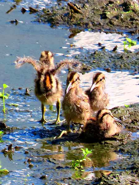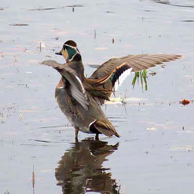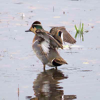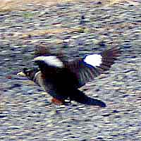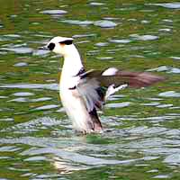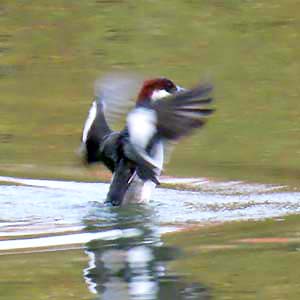 ![]() トモエガモ♀(羽ばたいている)と♂ トモエガモ♂3羽と♀1羽 |