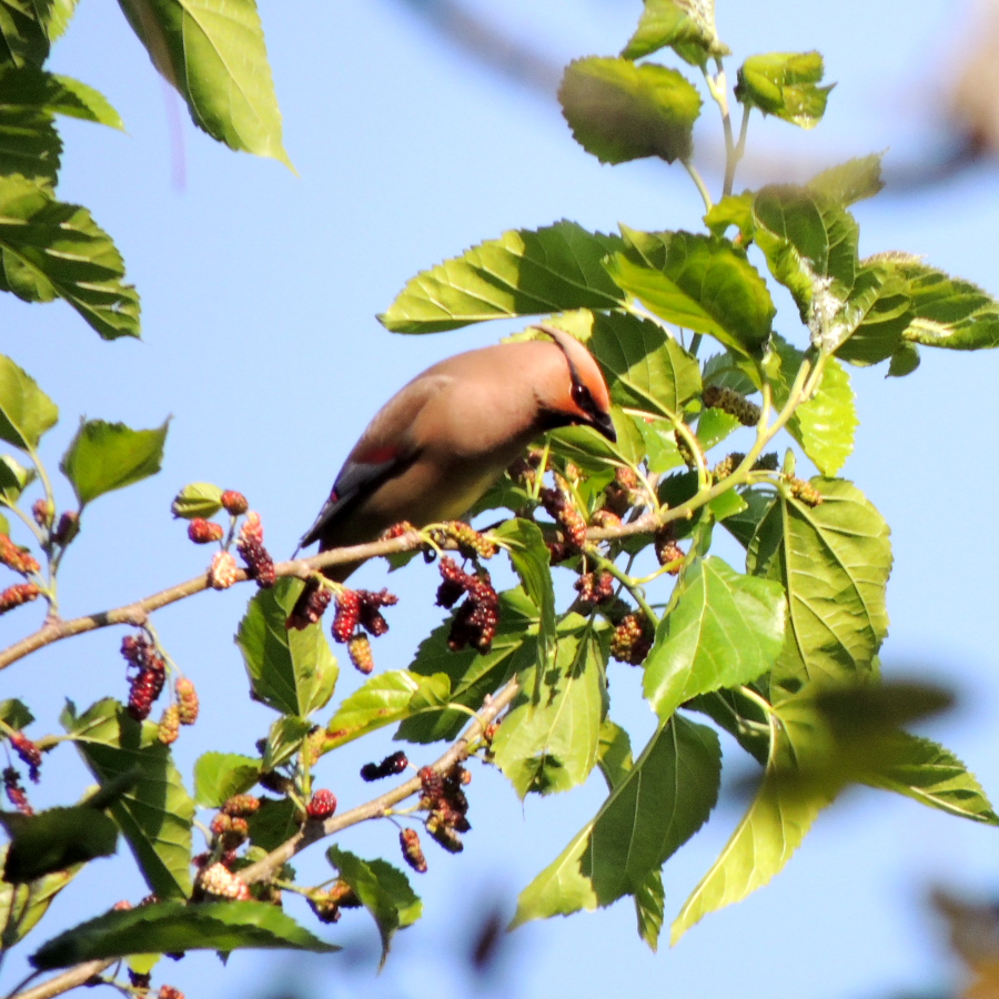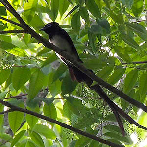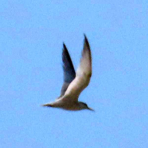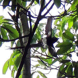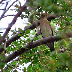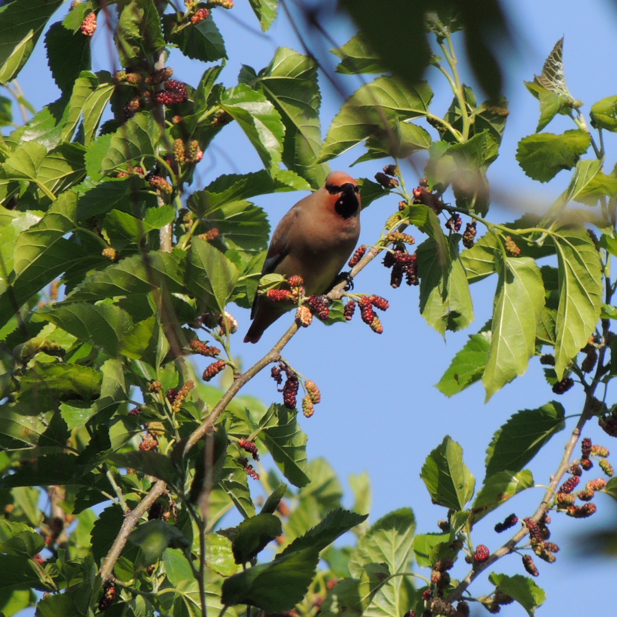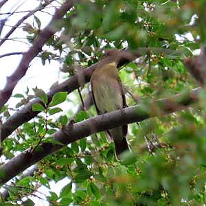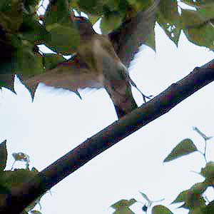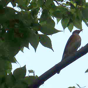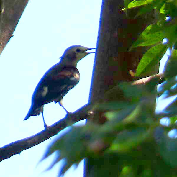 服部緑地でコルリ♀とヤブサメが出てすっかり満足していたら、今度は農業公園にコムクドリが居るとの情報。これは魅力の一種、ぜひとも行かなくっちゃぁ・・。ということで、すぐさま移動。行くと緑地の仲間が一人先に到着している。だが、ムクドリの群れは動いているがコムクドリは見当たらず、しばらく眺めて無駄足だったと帰りかけた。自転車で土手に上がり、念のためもう一度さっきの群れの居た椋の樹を眺めたら、「おや、コムクドリじゃないかな?」すかさず、やってきたこちらの常連さんが「コムクドリやないか!」と大声で叫んだ。やっぱり・・。それから他所に居た大勢がやってきてたちまち堤防は人の帯がずらりと並んだ。当のコムクドリは葉や幹の後ばかりに居てすっきり撮れないが、何とか証拠程度の少しましなのが数枚。う~ん、光線がきつすぎる・・。まぁ、今季初なので、良かったんじゃないの? | |