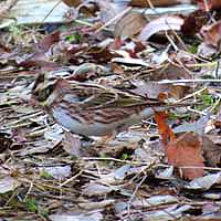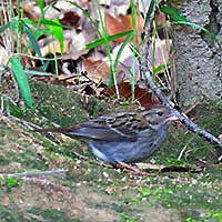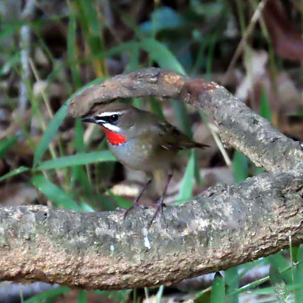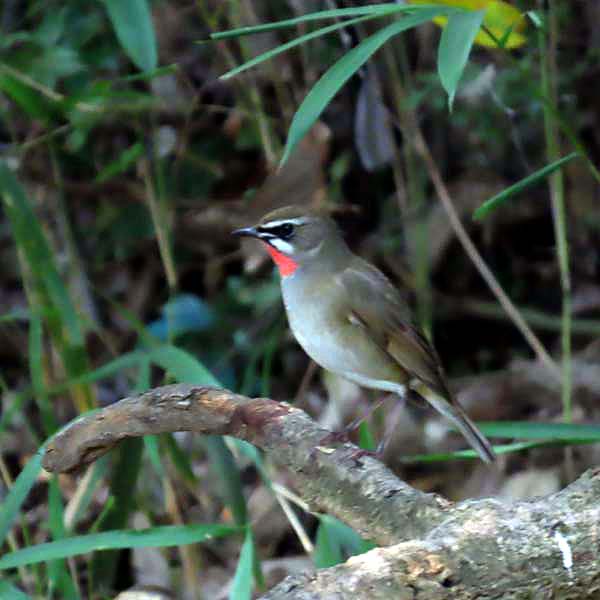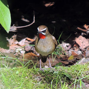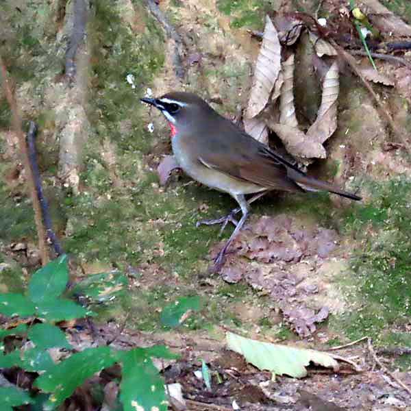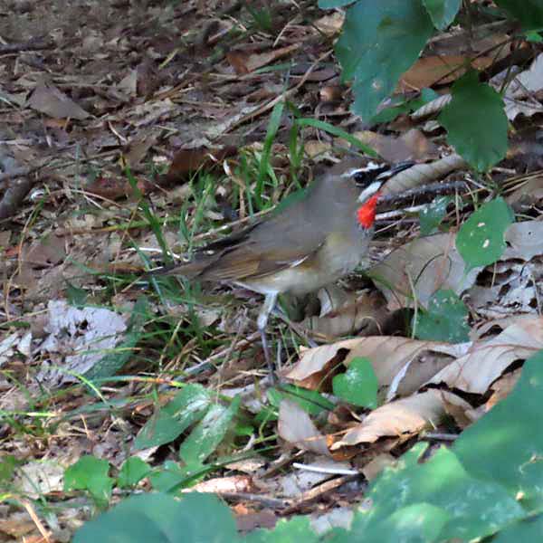 午前中オカリナの練習で、帰宅したら1時近かった。昼食をとり、お天気なので何処へ行こうかと、念のためブログで情報を調べたら、おぉ、南千里公園にノゴマ♂が出ている。しかも3日目。例年秋には是非とも撮りたい1種だ。「どうかまだ居ますように・・」祈る思いで駆けつけた。いつもの植込みの中ではなく、ツツドリの丘の餌場に3人のカメラマン。出ている最中か皆レンズを向けている。多少は工作しているとはいえ、とても自然体で緑が多く、明るさも何とかなる程度の暗さ。私のカメラは暗い所に極端に弱く、ピントが合いにくいのだが、ここなら何とかきれいに撮れる。いい具合に周辺をウロウロしてくれて、それなりのポーズも撮れて、あっという間に十分満足。鳥の中でも上位に位置するきれいな鳥だと私は思うのだが・・。 | |