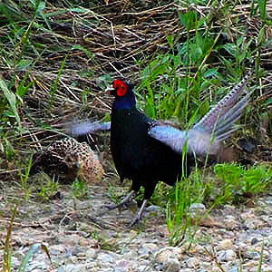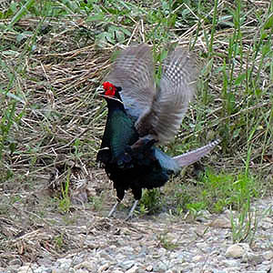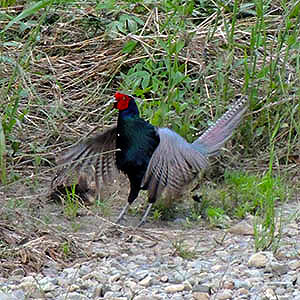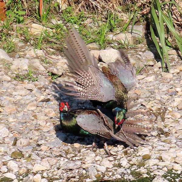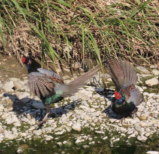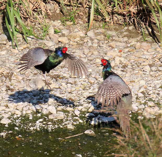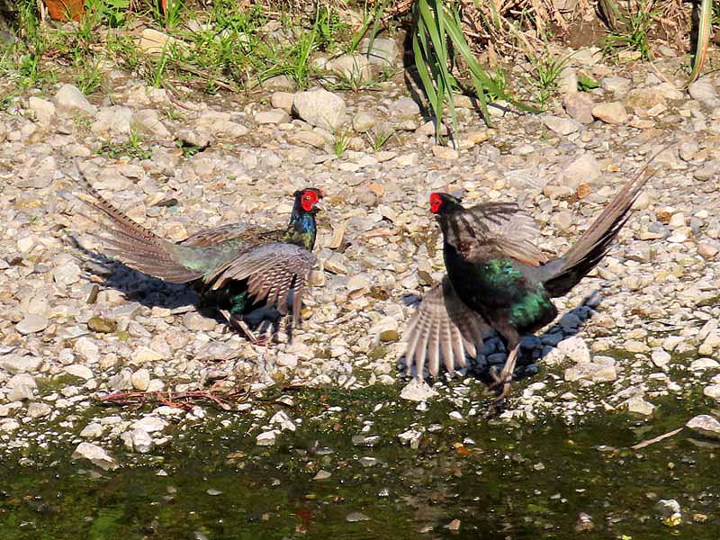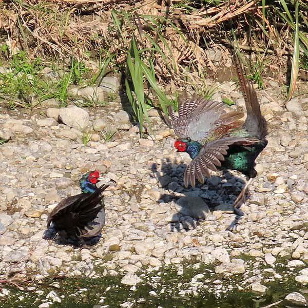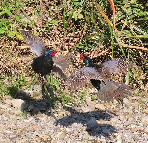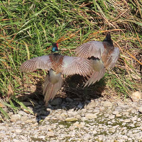 このところキジが良く出ている。しかし飛び物はなかなか撮れないものだ。一度でいいから草原を低く飛んでいく姿を撮りたいものだ・・。今日もブラリ猪名川を偵察に来た。ルリビタキなど出てないだろうか・・、などと思いながら、農業公園まで来ると、今日も小鳥はいなさそうで皆さん土手から河原を眺めている。ま、これからは猛禽の季節だからね・・。私も一緒に土手に並んだ。程なく水飲みにキジが1羽現れた。ラッキー!あれ、もう1羽居る、やはり♂だ。2羽は昨年生まれの子と親子かな?と思ううちに何やら険悪ムード。ついに、オス同士のバトルが始まった。多分親子ではなく、テリトリーが交錯している他人(鳥)同士?何度も何度も羽を広げ合って威嚇し合っている。見て居る我らは願ったりかなったりで、2羽のバトルを撮りまくった。なんとも優雅な鳥・キジのバトル、2羽の真剣さが伝わるかな? | |