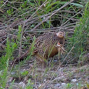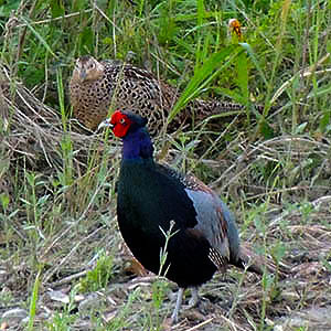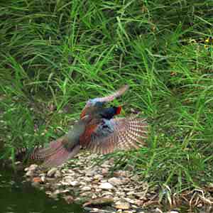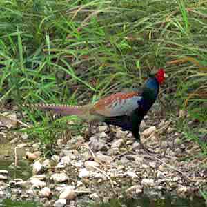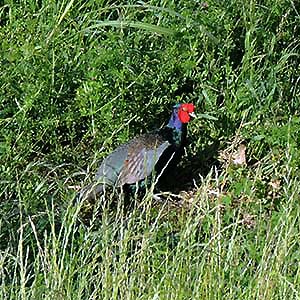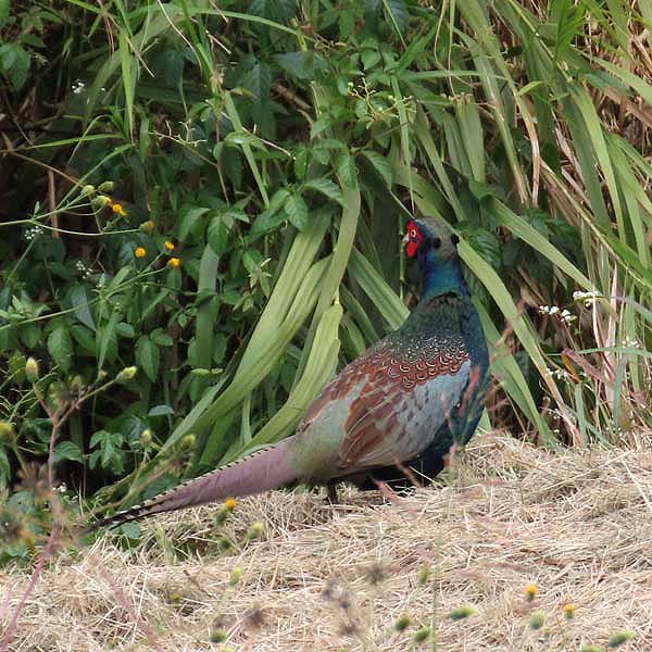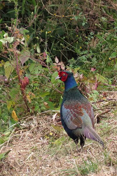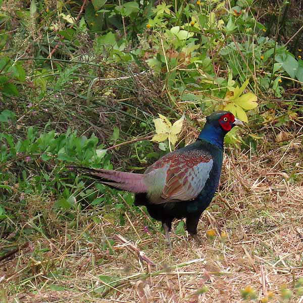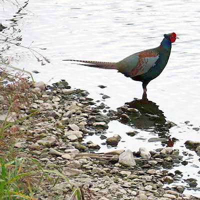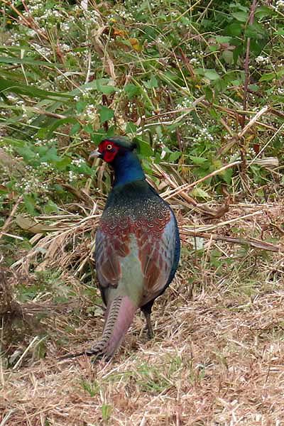 これからコンサートの日までは毎日一通りの練習を決めている。朝一リハビリに行き、オカリナを終えると、結構体力を使う。丁度お昼時、ご飯を食べると集中力が切れて、ふらり外の空気が恋しくなる。運動がてら自転車のハンドルは自然に猪名川へ向かう。ここ数年本当に良く猪名川を散歩している。淀川のように大きすぎず、適度な川幅で、四季の雑草が生き生きとして、可憐だ。今は徐々に草もみじへと変わろうとしている。向こう岸の人影や松並みが小さく見えて、いつも変わらず穏やかに日差しを受けている。水辺にはコサギやアオサギが点のように見える。何時、何度でも、見飽きない風景だ。 いつものように常連さんが堤防に並んで、どうやらキジの出を待っているようだ。最近は季節柄猛禽もそろそろ出だしたようだ。私は皆さんに挨拶だけしてすぐ引き返した。今日はただ散歩だけ・・のつもりだった。橋の近くまで来て、ふと足元の堤防下を見るとあれ、キジだ!皆さん向こうで並んで待っているのに・・。手を振って知らせて見たが誰も気づかない。すぐに草に潜るかと思いきやいつまでもトコトコと歩いている。キジってほんとに綺麗!日本の国鳥だよね。たっぷり堪能して、今日は大満足。 |
