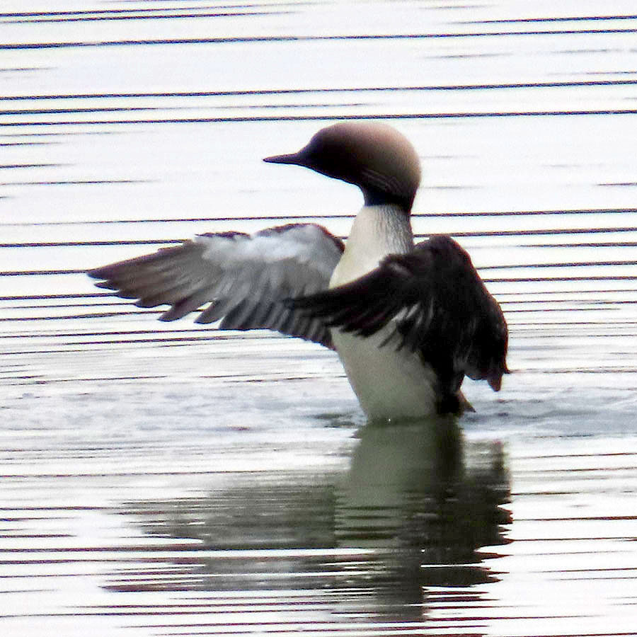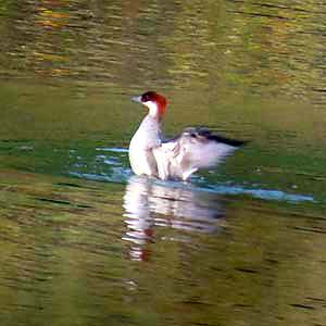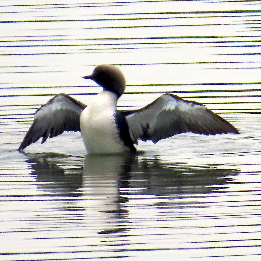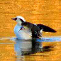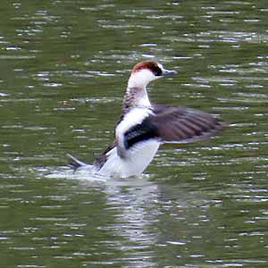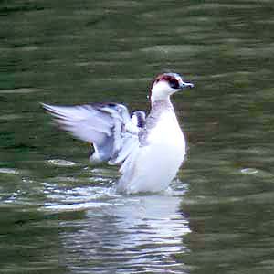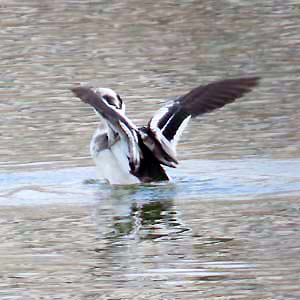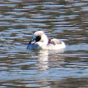 今年最後かな?緑地の新宮池に今度はミコアイサの成鳥近い♂が5羽入ったらしいので、緑地なら一番近いので飽きもせず行ってみた。なるほど、はっきりと♂と分かる白いのが居る。すぐに潜るので何羽居るのか分かりにくいが、しばらく動きを眺めていると、聞いた通り5羽を数えた。ミコアイサは良く羽ばたきをしてくれるので、少し気長に待つのがコツかな?欲を言えば、やはり真っ白になった完全パンダを見たいなぁ。 | |
