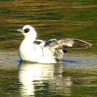 穏やかなお正月を迎えた。年賀状はほとんどメールに変えて、ポストにはわずかしか入ってないが、それでも出さずにいる人には急いでその日のうちに返信する。元旦はそんなことでのんびり過ぎて、もう2日目になると家に居る身の置き所が無い。少し曇りがちだが、マイフィールドの服部緑地を覗いてみる。さすがにほとんど鳥友さんには会わない。小鳥の森をすぐに出て、新宮池に行ってみる。大晦日からミコアイサの♂若が入っているらしいので探すが、見つからない。♀は相変わらず4・5羽が見え隠れしている。「居ないのかなぁ・・」期待外れかといぶかりながら場所を少し変えたら、偶然ヒョイと独特の白い姿が浮き上がった。「おう、やっぱり居たか・・」やはりミコアイサは♂でないと感じが出ない。少し若いが十分に♂の貫禄を見せている。羽広げもわずかに撮れて、毎年でもあり、一応納得。常連の鳥友さんとも会えて、しばらく雑談し、雨がパラつきそうなので引き上げた。真っ白なパンダガモは年初にふさわしく気分爽快。 | |