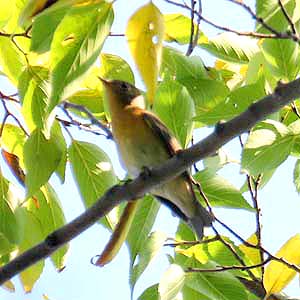 いよいよ10月。とはいえまだまだ暑い。体調がいまいちだが家に居たら運動不足だし、気晴らしがてら猪名川へ。ノビタキに会いたいのだが何故か先日以来とんと来なくなったみたい。公園に行くと知り合いが居て、何か狙っている。ムシクイのようだ。チョロチョロと見え隠れしている。あれ、これは?さっきからじっと動かない少し大きめな鳥、色柄からして何かの♀のような感じ。撮った写真をよくよく見ると、どうやらオオルリの♀っぽい。私としてはラッキー。もう少しちゃんと撮れていてほしかったけど・・。ムシクイはあっちこっち動き回って素早い。手当たり次第連写しまくり。帰ってチェックしたらかろうじて数枚ムシクイとわかるのがあった。何ムシクイかな? | |