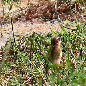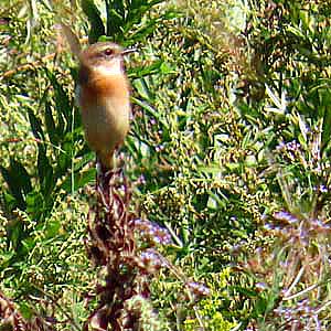 あちこちでノビタキが出ている。猪名川もこの2・3日様子見に来ているが気配なかった。今日も念のためと来てみたら、わぁ、カメラマンがいっぱい!やはりノビタキが出ているそうだ。「3羽だよ」誰かが教えてくれた。しばらくして一人が橋の下の方へ覗きに行って、あれ、カメラを向けだした。近寄ると、案の条ノビタキが2羽居る。慌ててレンズを向けて1回連写。葉が被るので少し場所をずらしてまた1回連写。「あ、動いた!」その後分からなくなった。あぁ、もう少し居てくれたら良かったのに・・。 皆さん携帯で盛んにノビタキの声を流している。「あれ、セッカの声も一緒に流している」と思ったとたん、ノビタキが堤防の斜面の草原に飛んだ。ちょろちょろと良く動くが何とか撮れている。誰かが、「セッカや!」と叫んだ。ほんと、目の前に居るのはセッカだ。そういえば前季も同じパターンで、セッカばかり撮ったっけ・・。ノビタキはそっちのけで可愛いセッカがしっかり撮れた。これはこれで大満足だ。・・だけど、ノビタキももっとちゃんと撮りたかったなぁ・・。 |