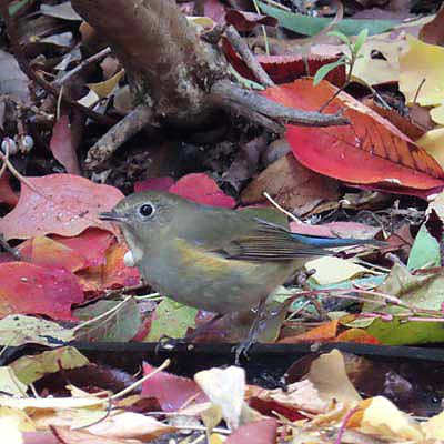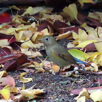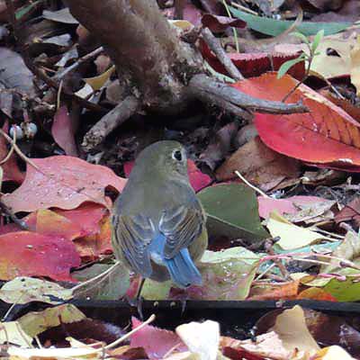 一昨日鐘の丘にルリビタキ♀が入ったらしく、昨日行ってみたが不明。どうやら午後になって出てきたらしいが、そんなこととは知らず、今日は淀川へでも行こうかと緑地を通り過ぎかけて、念のため鐘の丘の道を通ったら、数人が居る。あれ、また居るのかな?と近づいたら、ルリビタキの♀が出ているではないか。昨日午後から居ると聞いて2度びっくり。きれいに紅葉した葉をひき散らして、久し振りに緑地できれいな背景で鳥が撮れた。先日南千里公園でもルリビタキの♀だったので、余計にはやく♂に来てほしいよぅ。 | |