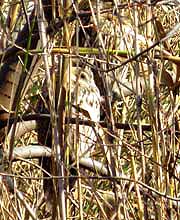鳥友さんから高槻の鵜殿にハイイロチュウヒの♂♀が居ると聞いた。これは大変行かなくっちゃ。どうやら19日(日)に野焼きするとか、それまでにゲットすべく何度か行こうと、いつになく気合が入る。昼過ぎに着き、夕方に賭けるが、ポイントに到着したとたんハイイロチュウヒの♀が飛んだが間に合わず。その後キジが一瞬出ただけ。夕方5時のタイムリミット直前に、一人のカメラマンがじっと空高くにカメラを向けているのに気づき、見たらハイイロチュウヒの♂が塒に向かって飛んでくるところだった。しかし思うようにカメラが扱えず、中途半端な画像ばかり、せっかくのチャンスだったのに・・。これで今日のパフォーマンスは終り。暗くなった堤防を降り、バスの座席に沈みこんだ。 | |