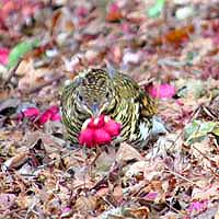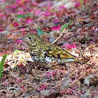 今日は服部緑地のトラツグミを撮りに行きかけて、時間が早いのでひょっとして霊園横のアオバトに会えるかもと回り道をしたのが正解。極楽橋の横手納骨堂側の高い木に数羽のアオバトがバラバラ飛んできたところ。空抜けで、高すぎるが取りあえず証拠にはなる。ひとしきり撮ってすぐに小鳥の森へ行ってみた。入口に自転車が2台、出てるのかなぁ?山茶花の花絨毯もまだしっかり綺麗だ。トラツグミは目の前の木に隠れているという。場所を教えてもらい取りあえず木止まりをゲット。その後下に降りてきて長~い間地べたをウロウロ。カメラマンには慣れ切ったようで、ほとんど動きも緩く、首を傾げたり1・2歩移動したり・・。たっぷり撮れました。 | |