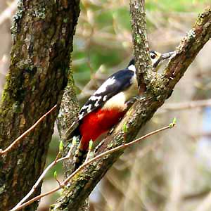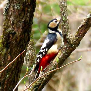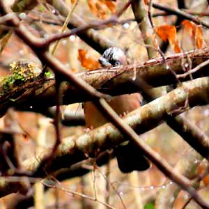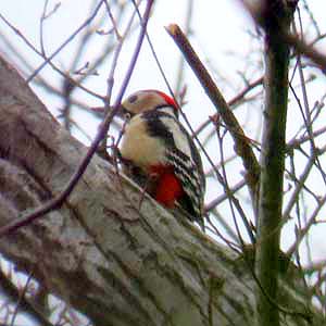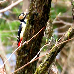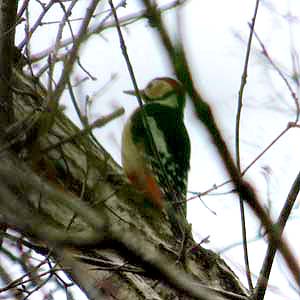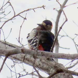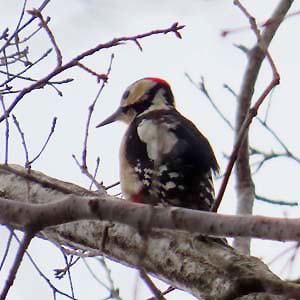 丁度一カ月前、ミヤマホオジロ目当てに来た時は見事に外れた。その時にも瓢箪池の方が面白いとは聞いていた。今日はそのきずきの広場側へ行った。ルリビタキの♂♀が居るし、何よりもアオゲラがよく出ていたらしい。アオゲラに関しては過去形で、今日はほとんど出なかった。代わりにというのも変だが、偶然アカゲラに出会えた。ルリビタキが居る木道のすぐ傍辺り。存分にルリビタキを撮って、移動しょうとしたら、ふと見上げた木にアカゲラが止まっていた。細かい枝をたっぷり被ってかなり難しいが、取りあえず確認できる程度で、少しづつ上に上がっていった。何とか全身すっきり見れないかと場所を変えてみたが無理。そして飛んでしまった。う~ん、証拠だけだな・・・。それでも、わぁ、大収穫だ! | |