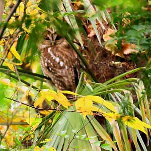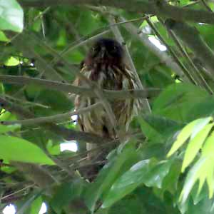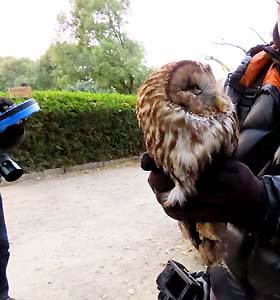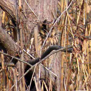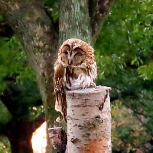 今日は休養日のつもりが、昨日長居植物園のフクロウをNさんが撮ったと、メールが入った。一昨日聞いていたが、探すの無理だと聞き流していたが、なんでも簡単そうなので、今日も思い切って出かけてみた。入口で係の人に聞くと、予想に反して難しそう。カメラマンも1・2人、フクロウ狙いではないという。勝手が違ってウロウロしていたら、偶然緑地のいつもの仲間4人とであった。強力な仲間だ。それでもフクロウを探すのは至難の技、見つかるはずがない。午後になり、地元の野鳥の会らしきグループが来られた。なんか様子がおかしい。非常に厳しい目で我々を見る。少し後、地元の人がしきりに双眼鏡で見出した。他を探していたOさんが通りかかって、後から見るとすぐに、「あ、居た!」かなり被っているが、確かにフクロウが居た!今日はほゞダメと思っていたので、躍り上がるほどうれしい。とにかく証拠だけ・・、変に動くと怒られそうだから、取りあえず顔が確認できる程度で我慢。一応フクロウが撮れた。嬉しい! 仲間と分かれて園内を一回り、フクロウ以外を求めて歩き出したらメール。「猪名川の農業公園にフクロウ全身!」しっかりと写真入りだ。うわぁ、大変!間に合うかな?時計を見ると14:30。長居駅に出て、桃山台へ、バスで家に帰り、それから自転車で農業公園へ。・・・? 農業公園についたのは16:30。事前にメールでまだ居るかと聞いたら「居ますよ」の返事。まだ取り巻きがいっぱい。写真通りに切り株にちょこんと全身を見せてじっとしている。左目が悪いらしい。ずいぶん弱っているそうだ。立ち位置を変えて色んな角度から撮って居るうちに間もなく薄暗くなってきた。「待ってもらってありがとうございました・・」僅かな時間に、このフクロウはもう助からない事が分かった。「カラスに襲われないように、竹林の中へ連れてあげよう」 翌日聞くと、やはり助からなかったようだ。(合掌) |