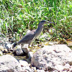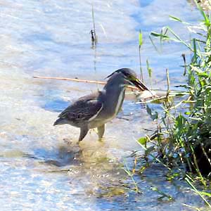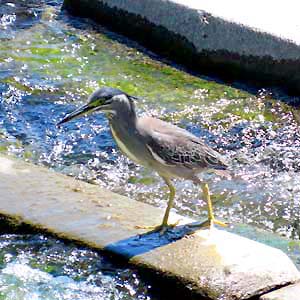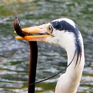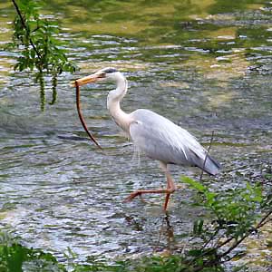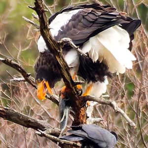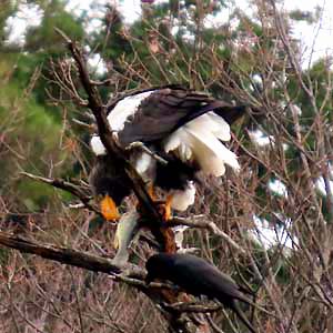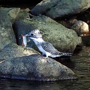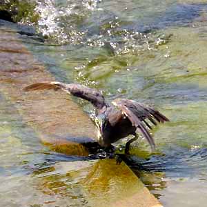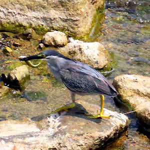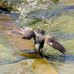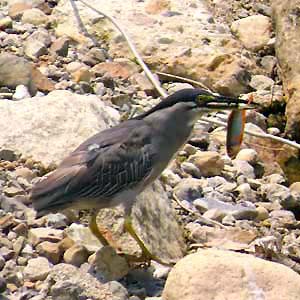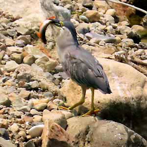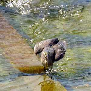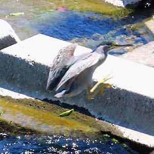 ![]() 元の場所で、捕った魚を食べている。が、周囲のカラスが隙あらば横取りしょうとうるさい。 |