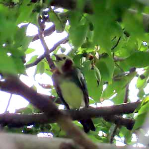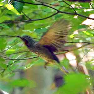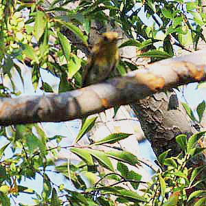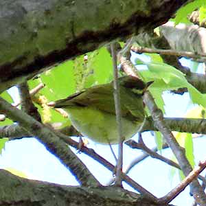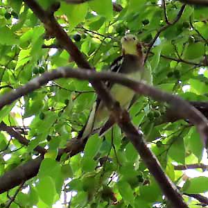 先日久し振りのマミチャジナイをしっかり撮れた後も、連日賑わっているようだが、私的にはオカリナの方が忙しく、久し振りに覗いてみた。マミチャの方はさておいて、小鳥の森はどうかなと行ってみると、いきなり2・3人がカメラを抱えて上を見ている。「アオバトだよ!」とTさんが教えてくれた。たしかに、高~い枝の梢に思いっきり枝被りで3羽居る。最近はほとんど見かけず、元々アオバトで有名な緑地なのにさみしい限りだと思ってたので、うれしい。ほんの5分ほどでどこかへ飛んでしまった。良かった、ラッキー! | |
