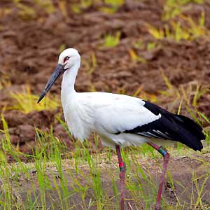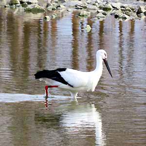 コウノトリA 仲間Bの方へと水の中を渡っていく コウノトリB Aよりも若いのか足環が新しい B、珍しく座り込んだ |