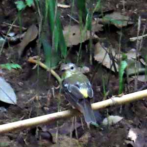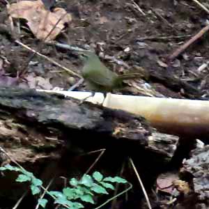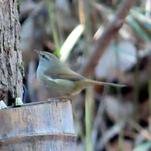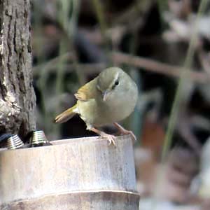 ![]() ウグイス ここでは毎回出てくるが、今日は新しく置いた竹筒の所で、すっきり撮れた。 |
