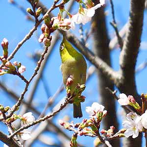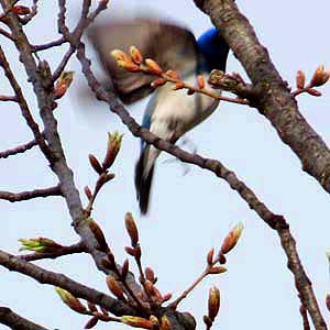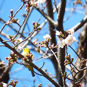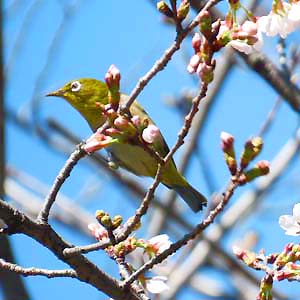 南千里公園から服部緑地へ、一目散自転車で駆けつけた。南千里では夏鳥のオオルリ、服部緑地では冬鳥のルリビタキと、まるで寒暖入り混じった今冬を象徴しているようだ 服部緑地は私にとってまぎれもなくマイフィールド。そのお膝元で、今冬一度も見られなかったルリビタキの♂成鳥がもう北帰するという頃になってから現れるなんて・・・、奇跡ではないか?。行くとすでに常連さんたちがずらりと並んでいる。餌付けが成功したとかで、さっきも現れたそうだ。「なんで今になって?」と誰しも思うが、「どうやら冬の間ずっと、民族集落の中で生活していたのかもね・・」程なく現れたが、警戒心が超強く、餌をとって木の茂みにもどる早業は半端じゃない。餌場に降りる前の拠点の枝は葉が邪魔をして、決して全身すっきりとは見えない。光線もきつ過ぎて、きれいなブルー色が出ない。色んなマイナス要素はあるけれど、とにかく証拠を撮っておきたい。傍の桜は一足早くきれいに咲きだし、メジロがチョロチョロと動いている。本命を待つ間の手なぐさみにさくらメジロなどをパチリ。 ルリビタキはなかなかすっきりとは撮れないし、警戒心が強すぎる。私はとりあえずきずきの森できれいなルリビタキ♂をたっぷり撮っているので、午後3時前に切り上げて、千里中央公園へ移動した。 |