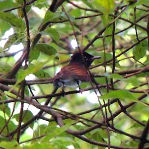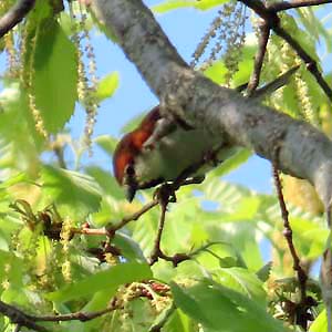 緑地にリュウキュウサンショウクイが毎日飛び回っていて、皆さん撮っていると、メールをもらった。居るとは聞いていたが、撮れてるのなら、と皆さんについて行った。エナガの群れに混じっているらしい。私一人ならまず無理な話だが、強力な人達が多いので、意外とよく見つけてくれた。4・5回は枝止まりを確認できたが、実際に撮れたのは1回だけ。でもでも、一応リュウキュウサンショウクイですよ! |