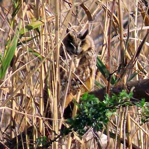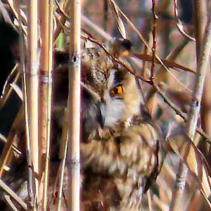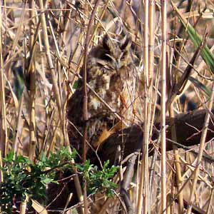 2024年2月24日(土) in猪名川上流 トラフズク→やっと確認 今冬は何度も猪名川のトラフズクが見られている。しかしその度にタイミングが合わず、撮りこぼしている。今日は午前中池田オカリナ倶楽部の練習日。ちなみに昨日は市民交流センターでのオカリナ発表会と、このところオカリナ演奏に明け暮れている感がある。 さて、午後の予定が終わり、家に帰る途中、鳥友さんから、「今、トラフズク出てるよ~」と電話。慌てて家に帰り、オカリナを家において、すぐに自転車で猪名川へ向かった。今居ても、数分後には居なくなるかもしれない鳥だけに、ただ祈る気持ちで走った。それでも以前のようにダッシュはできない。息が上がらない程度に、ゆっくり走る。それでも2週間前まではこんな風に自転車には乗れない自分だったと、つくづく普通に行動できる身体に感謝だ。1年間分のバス券を買って、何処へ行くのもバスと電車と決めて、自転車は乗れない自分だと諦めていたのに、2週間前くらいから突然身体が元に戻って、自転車も以前通りにスイスイ走れるようになった。体の何処がどうなったのだろう? ともかく、ポイントには数人のカメラマンが居て、トラフズクは例によってややこしい所に潜んでいる。それでも一応、全身の輪郭が分かるし、時折風のいたずらで邪魔な枝から抜けてくれる時がある。トラフズクなんて大体こんなものだ。できれば目をカッと見開いて、赤い両目が撮れたらもう文句なしなのだが、残念ながら、片目の見開きしか撮れずに終わった。でもでも、私には十分満足だ! |