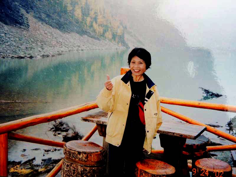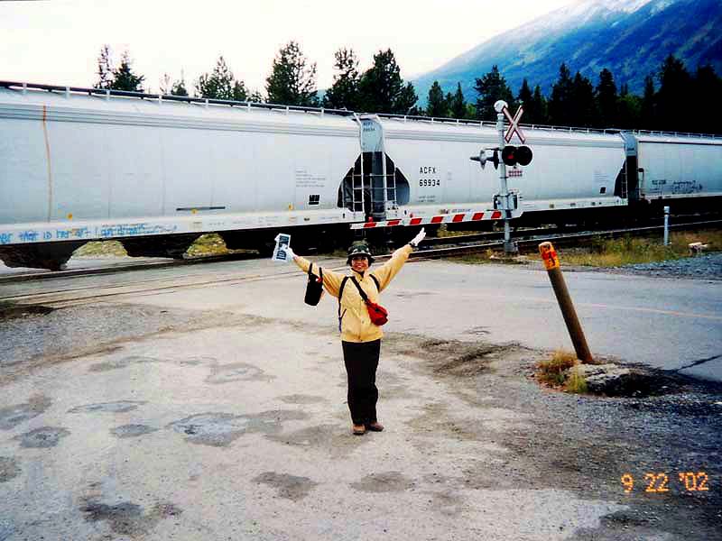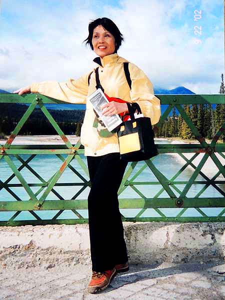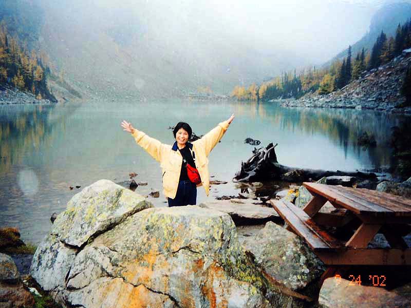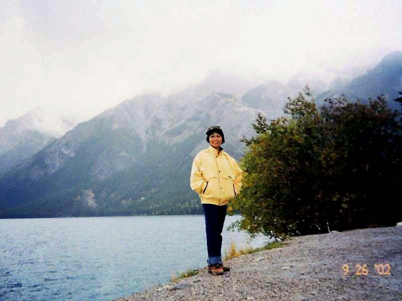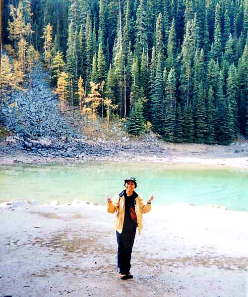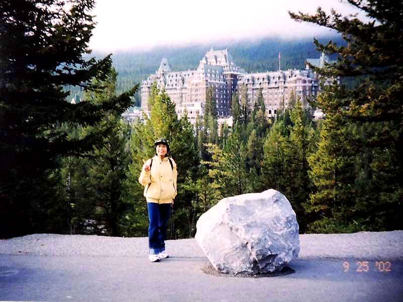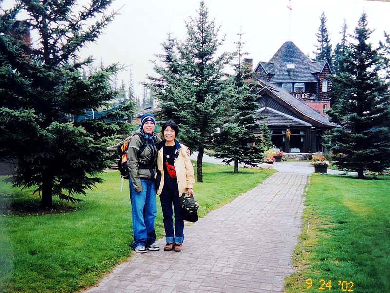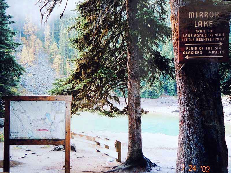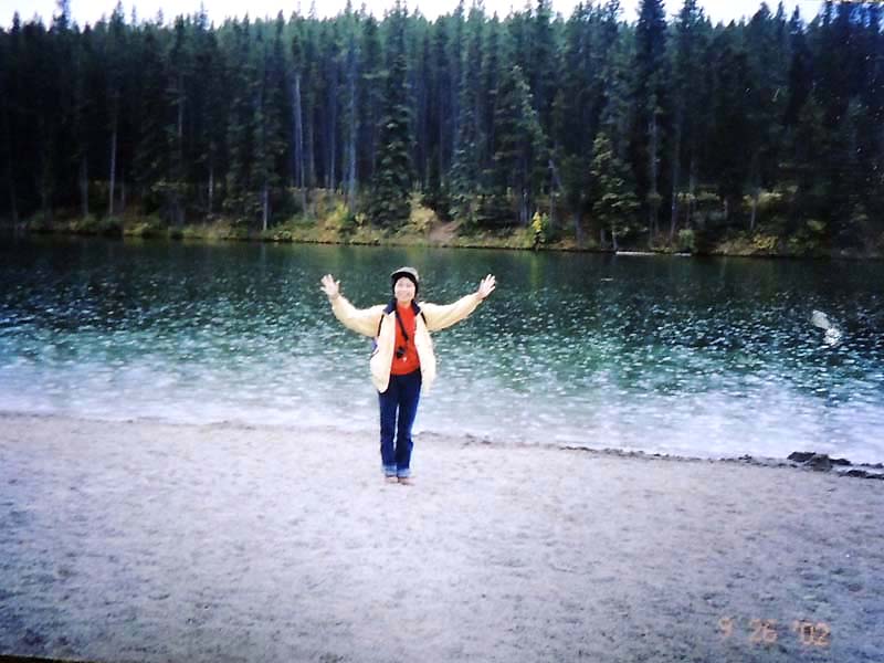 YH10:00→10:30in11:00→12:30Chateau Hotel13:00→14:30アグネス湖→15:30Hotel→16:30YH17:00→busデポ17:30→18:30Banff YH 朝一番昨日できなかったモン・トランプランのYH予約をしょうとTELしたが、カードがまたうまく使えない。 私は仕方なくOn-Lineで予約をとPCを借りたが、コイン$2で20分の時間はあっという間に時間切れ。スタッフに手伝って欲しいと頼んだが、やはり説明不十分で行ってしまった。やり直して又時間切れ。結局予約は取れないまま、10時のチェックアウトの時間になった。慌てて荷物を部屋から出したので、洗面所に化粧道具を置き忘れたのを後で気が付いた。つくづく1泊のみの移動は落ち着けないと痛感する。とりあえず荷物を預かり室に置き、今日1日の行動を開始。 先ずinへ行く。何処へ行っても頼る所はinしかないのだ。直ぐに順番がきた。私は先ず、Mont-Tremblant(モン・トランプラン) YHへの電話の仕方を聞いた。昨日からどうしても通じないと言ったら、私のテレフォンカードでスタッフが先方に繫いでから交代してくれた。話は簡単、これで9/27の宿泊はOK。さすがin、やっぱり頼りになる。 次に今日夕方のバンフ行きのバスチケットを買い、やっと今日の予定アグネス湖への地図をもらった。 既に時間は11時。昨日見た(シャートー・レークルイースへ今度はハイキングで行く。横からサイクリングの数人が走り抜けて行くのを見て、自転車を借りれば良かったと後悔する。 歩き出して直ぐ、ニッキーという女の子に会った。見るからにボーイッシュな感じで、てっきり男の子と思っていたら、Chateau Hotelに勤めていて、今出勤途中だと言った。Inでコースを確認したが、少し不安だっただけに、地元の人なら安心と同行を頼んだらあっさりOKしてくれた。まだ少女のようなあどけなさで、ヘッドフォンをつけて何やら音楽でも聴きながら歩いていたが、私が遠慮なく話しかける度にヘッドフォンをはずしていた。私が60歳だと言うととても驚いて、感心していた。そのうち、又熊の話になり、姿勢を低くするなどの熊対策をしきりに教えてくれた。広いbus道を行けば安全で分かり易いのだが、ハイキングコースは道から外れて森の中を歩くようになっていて、丁度今にも熊の出そうなところを歩いていたので、彼女の存在は頼もしかった。 あっという間に1時間を歩き、しかしそんな彼女も道を間違えて、うっかりMoraine Lakeの方へ行きかけていた。私が色々話しかけるのでいつもの調子を狂わせたのかな?しきりに謝る彼女に笑って「Don’t worry!」と答えて、自分も地図で確かめる。歩いた時間からしても、もうほとんどHotelの近くまで来ているはずなので、広い車道を行くことにして直ぐに昨日見覚えのある場所に着いた。ここで気のいい彼女と記念の写真を撮り、別れた。 私はhotelの軽食店でパン(ケーキのように甘い)とコーヒーを買い、他の旅行客に倣(なら)って、廊下の窓ガラス前に腰かけて食べた。人気のある有名なホテルだけに人で溢れていた。運悪く、食べ終わろうという時にそれまでのお天気が信じられないほどのものすごい雨になり、これから本番のアグネス湖行きが危ぶまれた。が、幸い20分くらい待つと今度は又信じられないほどの上天気に変わり、湖の上に虹まで見えた。 時刻は午後1時。夕方までに荷物を取りにYHに戻り、バンフ行きのバスに乗らなければならない。ここまで予想以上に時間がかかっただけに大丈夫かな?という気もしたが、行ける所までで帰ってこようと割り切る。 Hotelの左側から回り込み裏手から山へと道が付いている。しっかりした道で標識もはっきりしている。これは迷いそうにない道と思えたが、やはり人は少ない。と言うよりはほとんど見かけない。数グループが下りて来るのに出会う。いずれもツアーガイド付き。が、これから登る人はいない。当然「熊に注意!」の立て札が目立つ。いつもいつも何故こんな風に孤独なハイキングになるのだろう。もっと大勢の人がハイキングを楽しんでいそうなのに…。自分流に考えると不可解なのだが、現実は皆、楽な観光を好むのだ。 自問自答しながら歩くこと数10分。道がつづら折りになった曲がり角、木々が空けて見下ろした先に飛び込んだ光景に、私は目を疑った。「これは…!」神秘とも可憐とも幽玄とも・・・、絶句の美しさのchateau Lakeが静かにエメラルドグリーンを流し込んでいた。 来た甲斐があった。楽しくなった。道をどんどん登り、ミラー湖に着いた。ここが一つ目の目的地。山の中の 湖は周囲の木々を水面に写して、鏡のごとく静まりかえっていた。 小休止の後、更に登る。まだ時間の方は何とか行けそうだが、やはり急ぎ足になる。それほど長いコースではないはず。だんだん高度を感じて頂上が近づく予感。岩が多くなり足場が悪くなる。階段が現れ、登りきった所に、見えた、アグネス湖。頂上に位置する湖・・・。 ログハウスの営業小屋があり、カップル・グループなど数人が談笑している。ここまで来たらやたら