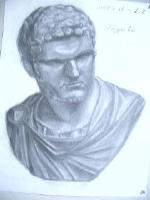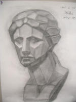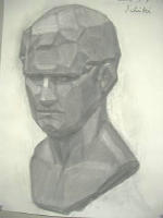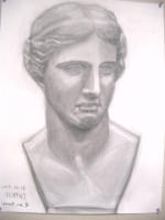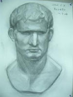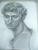 1/26から始めた「カラカラ帝王」がやっと仕上げとなった通産6ヶ月経っているが、間に写生会が入ったり休みが3回もあって、結局は全6回での完成ということになる。 回を重ねる毎に難しくなるのは当然だが、この作品はどの先輩達も特別苦労するので有名。髪の毛も服のドレープも複雑で正確に描こうと思うと気が狂いそう。未だに影を大きな面で捉える手法が身に付かず、部分々々をチマチマ描いている。次回こそ影と光で立体感を出す手法で描いてゆこう。 |