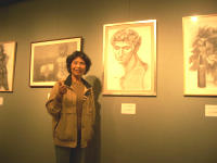初めての作品発表会。姉をはじめ、ITリーダーの仲間やオカリナの仲間が見に来てくれた。取りあえずはお世辞で「上手く描けてるね」と褒めてくれた。中で本格的に絵を始めた若い友人が、私のタッチを「勢いがある」と評してくれたのが一番嬉しかった。そろそろ水彩か油絵を始めたらと勧める声が多い。油絵の方が私向きなのかも・・・。あぁー今やってる何かを止めないと時間が無いよぉ。 | 搬入日、自分の絵の前で。 |