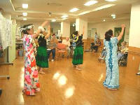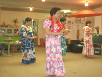 ここでのボランテイアは4回目になるかしら?。 踊った曲は「アロハウクレレ」「ブルーハワイ」「バリバリの浜辺」「瀬戸の花嫁」「夏の思い出」全5曲。 例によって、私はオカリナ2曲(「童神」「千の風になって」)を吹き、他にウクレレの伴奏で唱歌など数曲。最近、踊りの方もやる気が出てきて、自分で踊り方のマニュアルをパソコンで作成。踊りの手順をマスターした後にこそ、細かい振りの工夫などに神経が向くというもの。最近先生の口癖が「指の先まで神経を尖らせて!」 フラダンスを習いだして約2年半、そろそろ中堅の扱いになってきて、4月からは会計を担当することになった。ちょっとのつもりがだんだん深みにはまって行きそう。 |