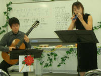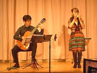 | 2008年11月22日(土) inドーンセンター サウンドリーナ発表会 小林理子先生の門下生の発表会。個人レッスンが軸なので、ほとんどが独奏。中に4つのグループ演奏をはさんである。後半になるほどベテラン生徒さんの堂々たる演奏が続き、理子さんの教え方の良さが彷彿される。私もあんな風に演奏出来たらいいなぁ。 (写真は最後に演奏された理子さんと加治川 岳さんのギターデュオ) |