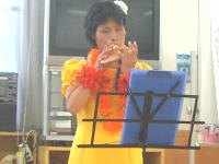 | 2007年10月1日 in二葉園(障害者介護センター) フラダンスのグループでのボランテイアで、障害者介護センター・二葉園へ行き、私はオカリナを独奏した。今日は少し上がり、所々間違ったが、皆が一緒に歌ってくれていたので、あまり目立たずに済んだ。 曲は、「もみじ」「ふるさと」「見上げてごらん夜の星を」の3曲。 |